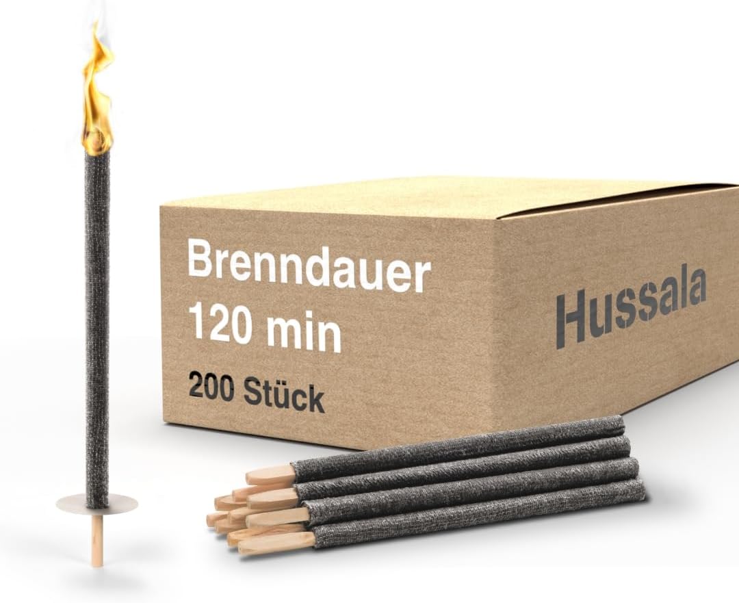 Hussala Diamond Wachsfackeln 200 Stück / 120 min mit Holzstab und Tropschutz, Garten Fackeln aus Diamond-Wachs