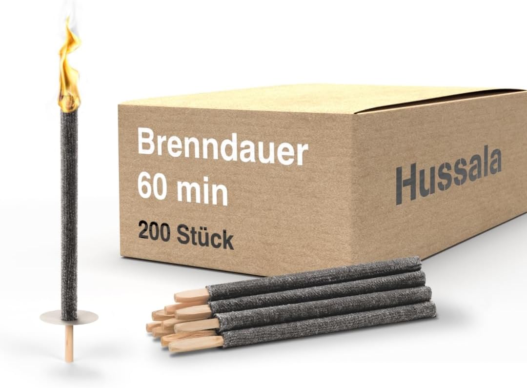 Hussala Diamond Wachsfackeln 200 Stück / 45 min mit Holzstab und Tropschutz, Garten Fackeln aus Diamond-Wachs