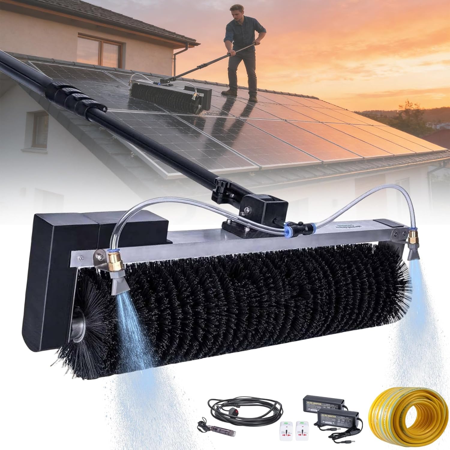 Elektrisches Reinigungswerkzeug für Solarpanels, 60 cm Rollenbürstenkopf, Solar-Reinigungsbürste,Reinigungsgerät für Photovoltaikanlagen, wasserbetriebenes Reinigungsset mit Stange 7.5m/25ft