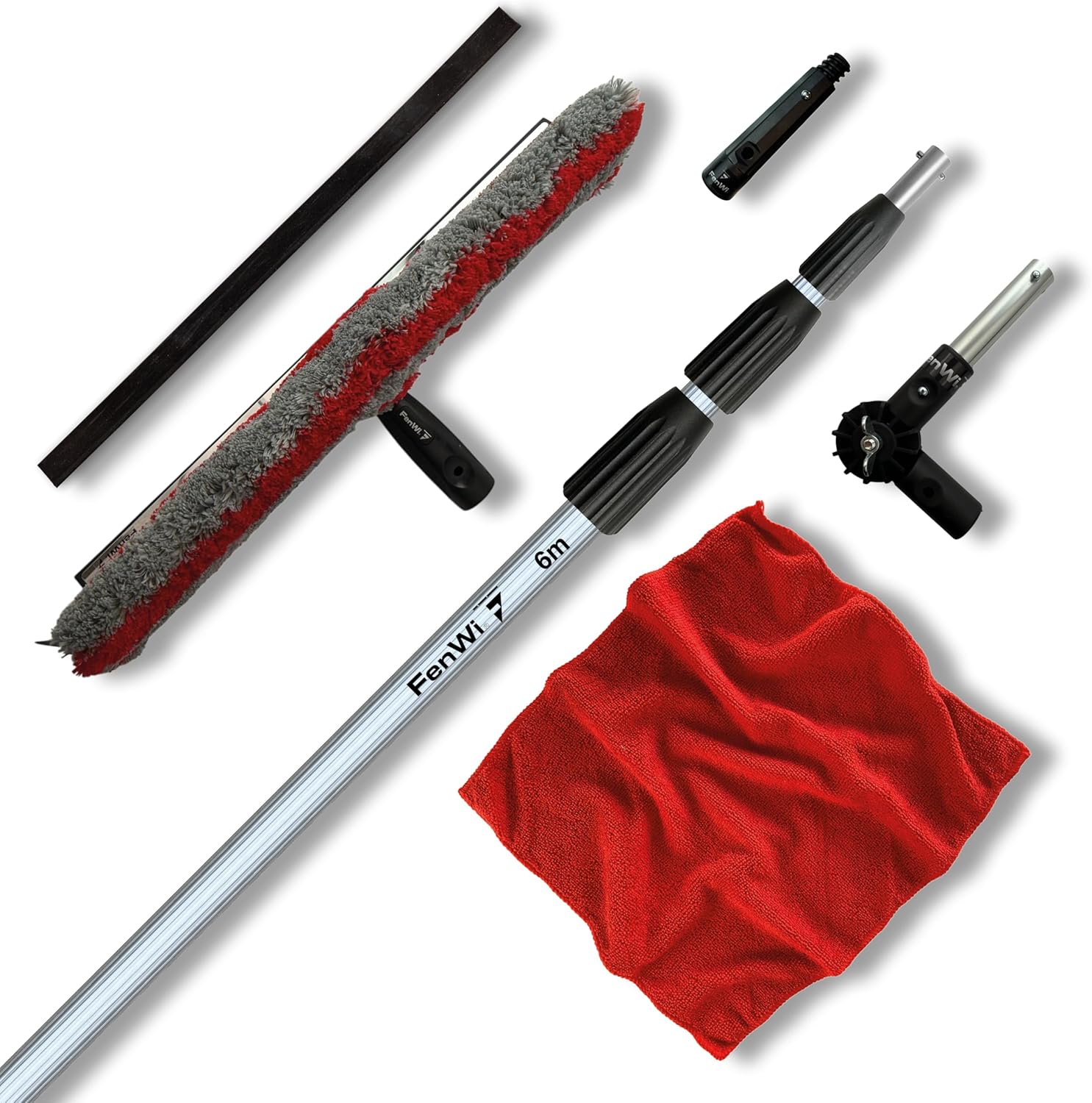 FenWi 6m Teleskop Fensterputzer Profi Set mit Abzieher Gummilippe Microfaser Kombi Fensterwischer 45/50cm Gelenk Alu Teleskopstange 600 cm I für Wintergarten breite Fenster Solaranlagen Reinigung