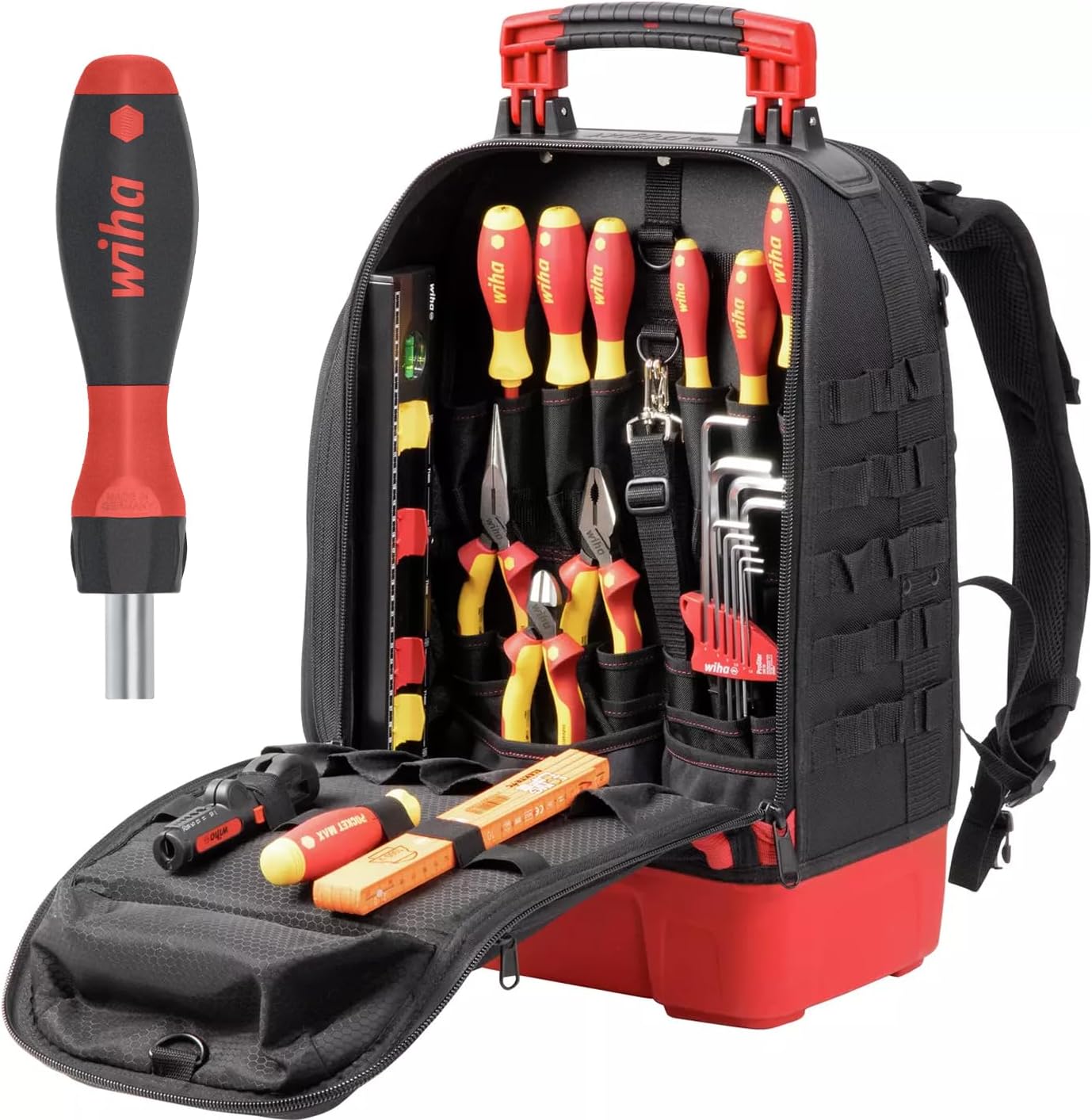 Wiha Elektriker Werkzeugrucksack 27-tlg. I mit Elektriker Grundausstattung I stabiler Standboden I mit Laptopfach I Taschen für Zubehör (45528) (Standard inkl. Ratschenschraubendreher (47169))
