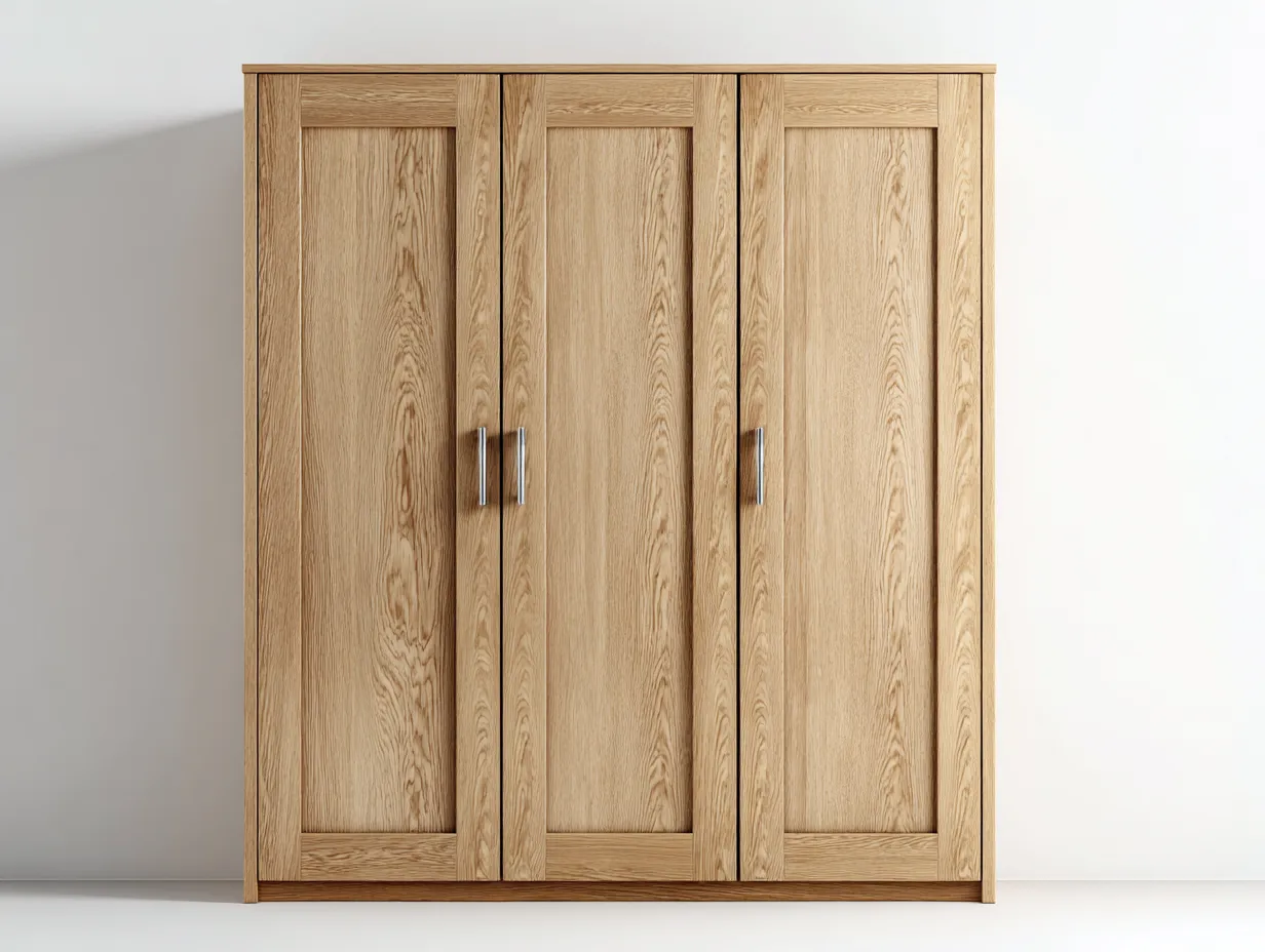 Dieser Kleiderschrank mit drei Türen bietet eine stabile und funktionale Lösung zur Aufbewahrung von Kleidung im Wohnbereich. Die warme Holzoptik und das klassische Erscheinungsbild machen ihn geeignet für Schlafzimmer, Gästezimmer oder Ankleidezimmer.